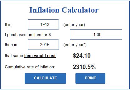 According to InflationCalculator.com, the purchase of a $1 item in 1913 now costs you $24.10 as of July 2015. You can thank the Federal Reserve for the devaluation of your hard-earned paycheck.