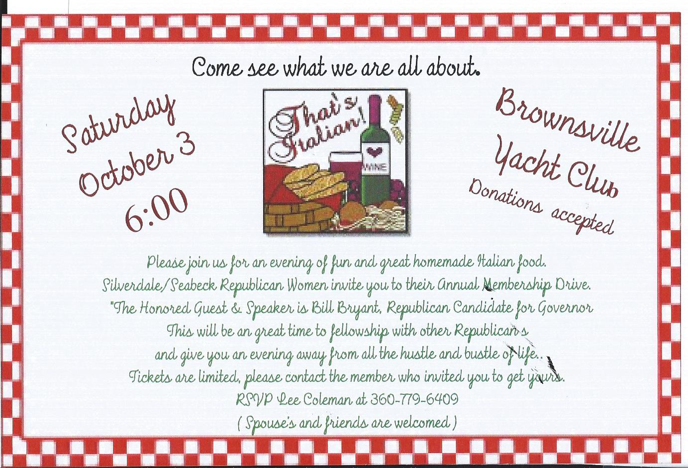 Our friends in the Silverdale-Seabeck Republican Women (SSRW) are holding a fundraising event on Saturday October 03, 2015. The choice of an Italian dinner was inspired by those who visited Italy this summer and took Italian cooking classes. The dinner will feature guest speaker Bill Bryant, candidate for governor.
