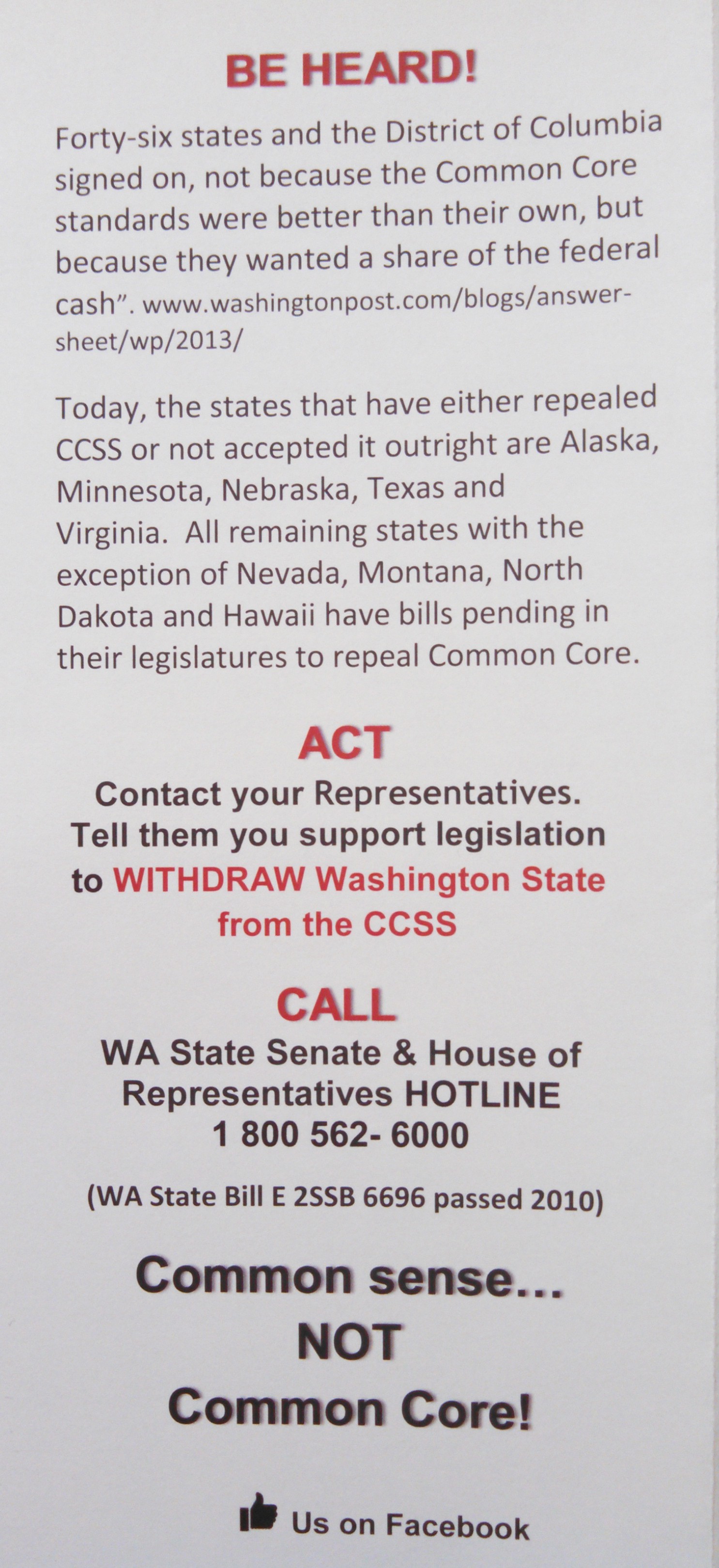 Remind them of the exciting news that the Washington State Democratic Party has adopted a resolution opposing Common Core! In July 2013, the Kitsap Patriots Tea Party adopted a resolution of our own opposing Common Core. We look forward to working together with Washingtonians of all political persuasion on this critical matter of our children’s education.
